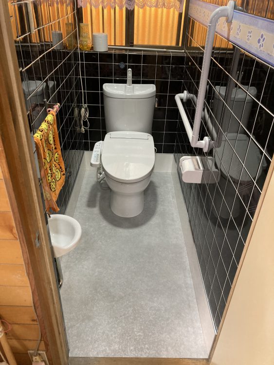 「以前は簡易便座がずれて怖かったんですが、今はしっかりしたトイレで安心です。手すりもついていて立ち上がりがとてもラクになりました!」と喜んでいただきました。《高松市I様邸》
