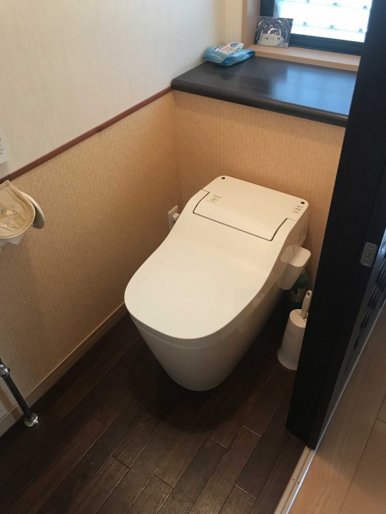 タンクの水が止まらなくなり、お困りのご様子でした。当初は修理対応でしたが部品が無くて取り替えることになりました。タンクがなくなることで生まれるスッキリ感や洗剤で便器を自動洗浄する機能に満足されています。