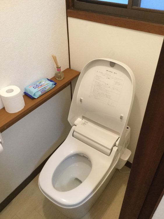 暗いイメージの老朽化したトイレをリフォーム。便器が綺麗になったのをきっかけに、ご自分で床のクッションフロアや壁紙をDIYされました。タンクレスのアラウーノはスキマレスでお手入れが楽になったとお喜びです。《さぬき市H様邸》